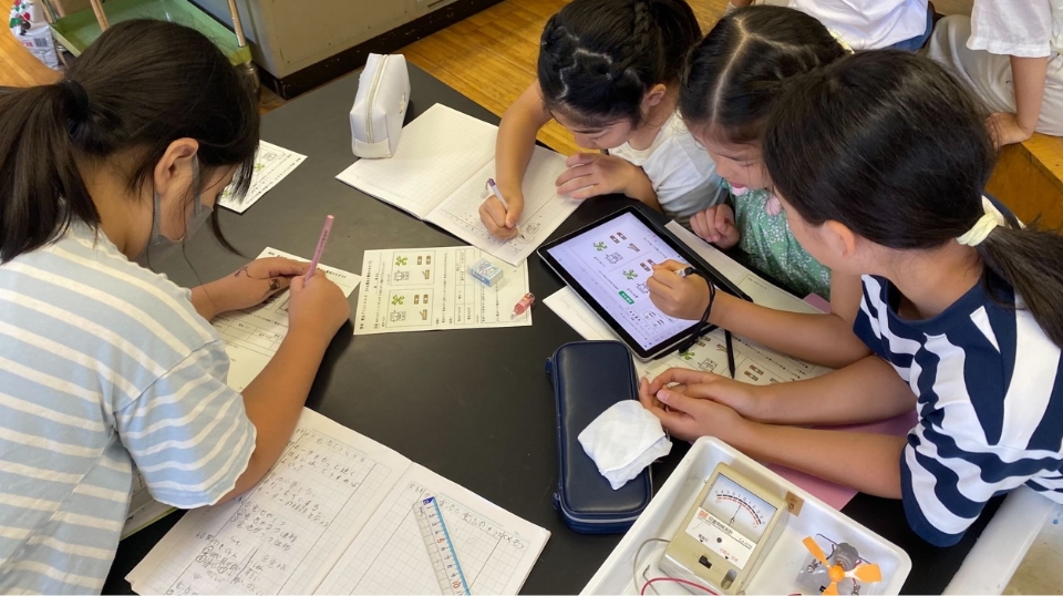 自ら問いをもち、仮説を立てて、電池の数(量)や直列・並列などのつなぎ方によってモーターの回り方がどのように異なるかを比較する実験を行い、結果を分析して自らの仮説を検証している。