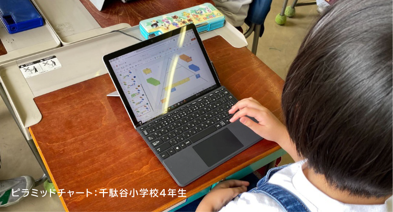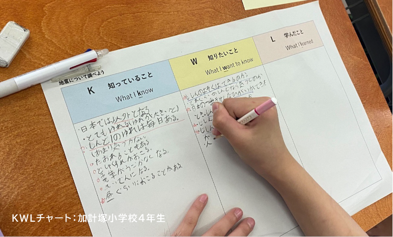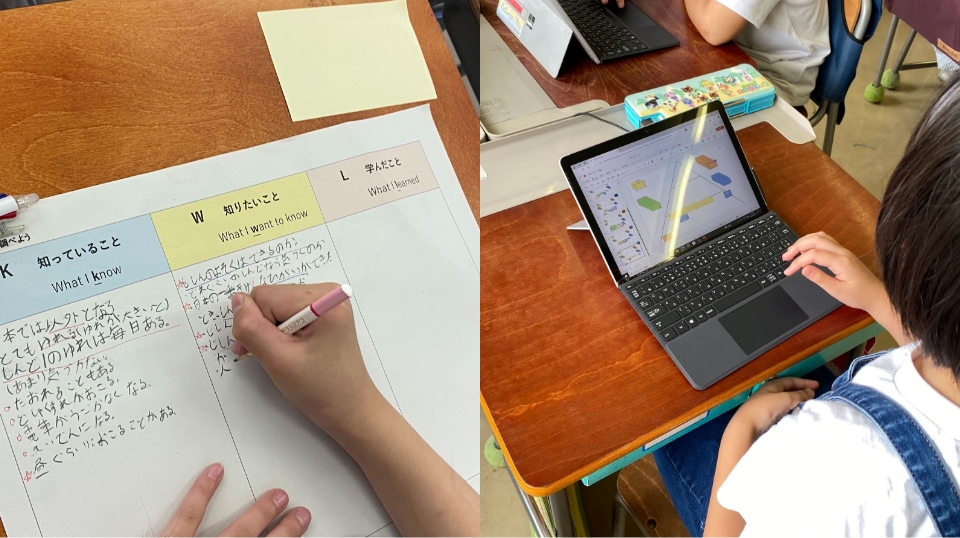 児童にとって身近なテーマを取り扱う中で、KWLチャートやピラミッドチャートなど思考ツールの使い方を実践的に学ぶ。このようなプロセスを経て習得した思考ツール活用スキルは、探究における問いの精選や情報の整理・分析等の場面で学びの質を向上させる。